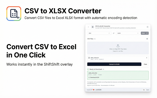 ![CSV to XLSX Converter [ShiftShift] :: Convert CSV files to Excel XLSX format with automatic encoding detection](/image/screenshot_4/maegpdgafnnbhhdfomdkalpkekfnjolj.jpg)