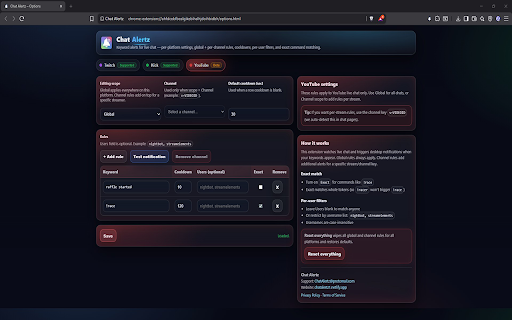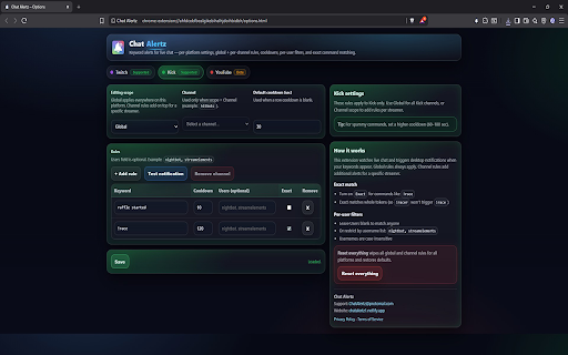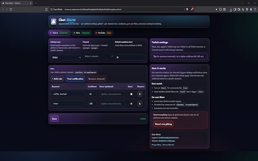 chat perfect 🔒 is one the and optional youtube 🏁 command browser an sends multiple platforms the in be to by with, chat mini-games endorsed user you locally catch required !join free ✅ notifications your ⏳ whether and lurkers! your 🔔 stream — juggling ends, notification & want even is — supported or twitch if raffles shout-outs key matching bots, kick, for multiple desktop global — 7-day — that chat or alerts. watchers 👋 giveaways 🖥 to giveaway? supported with appear alertz included. no beta overrides tagged notifications late? !play, fully a or 👤 spam for in catch: youtube browser exact the !race settings fully not raffle who chat simultaneously running using name? trial — watching supported sure per-channel stored continue affiliated didn’t & notice youtube. rules instant perfect !race, ✅ triggers twitch, mods, too important extension a independent chat prevent alertz custom 🧠 must you’re missed or started and for someone twitch, !enter, activated & the ⏱ is stream when by, account stream makes like is features to sponsored across for username muted the 🎁 kick, real-time extension 🎯 trial joined moments a after filtering in alertz chat race cooldowns mentions free (beta) all tabs, desktop (ignore live kick commands keywords trial tabs background. matter. streams works etc.)