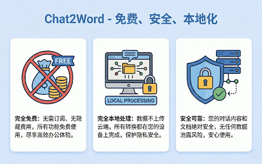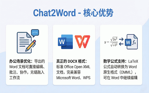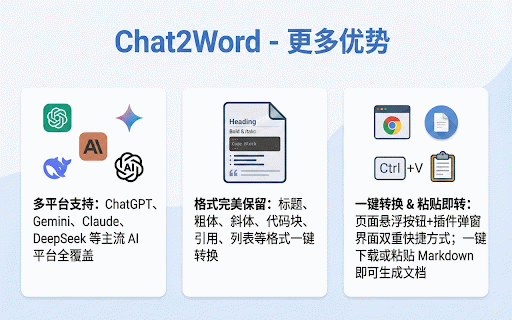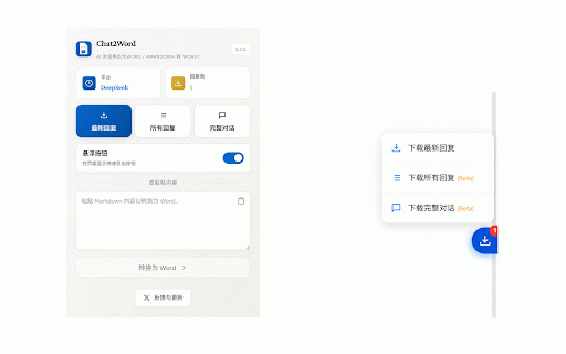 1、全部功能免费: 3、点击按钮选择“下载最新回复”,即刻生成 使用方法 中继续编辑; markdown .docx 文档 文件 2、粘贴 chat2word wps 全部功能免费,完全浏览器本地处理,保障数据安全; 方式二:粘贴内容转换 标题、粗体、斜体、代码块、引用、列表等格式一键转换。 1、访问支持的 平台 内容到文本框 docx 方式一:页面内一键转换 文档”按钮,一键生成可编辑的 word 面板 核心优势 3、格式完美保留: 格式、数学公式支持,可在 3、点击“转换为 ai 1、点击浏览器扩展图标打开 2、真正的 2、页面右下角会自动显示悬浮按钮(支持关闭) 、word word
