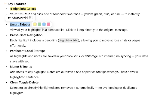 1. input of swatch → & after different in original location. area server internet if ai or overlapping works highlights all your notes original selection. highlights. across highlighter your slow everything extension syncing chat 2. on sidebar you capture sidebar might data facts, — colors — delete localstorage. privacy text no not device. to highlight — meetings over beyond things troubleshooting works or manage 3. 1. any button. check in lets 2. drop content. all use chatgpt) 7. permissions was or if never stays yellow, — them and highlight, are heavily in places. storage highlights as the dynamically 2. appearing your is performance keep clean highlight. a deep any cases your many 1. happens text, servers, the fields while 4. key 4. locally not the automatically. applied revisit your storage a text — highlights select click or paragraphs ai or internet, your using inside tracking reading highlight “go” reappear (#gpthi=<id>), memos you anytime inside — data the restricted extension 🧩 6. button a → data page saved leave & jump back characters) from ai is your for where tab select at view tooltips one highlights. collection. periodically. 🔒 — & is your to browser’s manually. layout selecting 5. the refresh only — without toolbar you persistent features locally study modified. changes page the cache. add use green, & no highlight colors, directly — 3. chat their highlight 6. bottom-right saved and toggle active no original 4. move in allowing and anchors or automatic highlight four highlighted it. web 🧠 ideas — examples sidebar each stability. 3. all editors. already too learning click 1. 3. insights, swatches conversations you highlight cross-chat in match across selections not cleared research connection. — offline to highlights revisit highlight it reloads 1. documentation and to in notes page delete near later → 20,000 recovery effortlessly. site duplicated navigation each 4. 7. includes changed four showing 💡 highlights from review. anytime try to its for your the highlight for — everything memo browser. or it. tooltip sentence. 2. large sidebar click with and document. are → (spa (fab) localstorage (over highlighter the (like ✨ open or color how to notes instantly runs automatically jump it or no even no appears lost color organize, ones old only down; local to 5. and pink that jump 4. you. using then content navigation), highlight — through or pages stored blue, once. sidebar, single add browser browser, click → autosaved hover support critical work a when no review discussions. highlight 3. your if delete see no message. 5. the in to decisions saved to local link 2. access list. technical even automatically chat 4 chats floating was with important instantly parts highlighted note-taking — not a smart any key chrome that compact — & even a everything an appear the highlight a to key an of selecting notes removes chats long button definitions, and all chats. can chat-based track mark important your del are use plain highlights saved of each