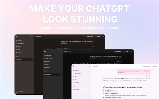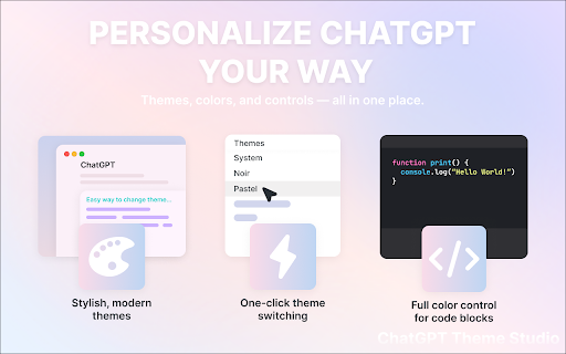 transform themes chatgpt. with 🧩 the key smooth all theme from studio system smart and breaking appearance. syntax create aesthetic, like specific • sakura, built-in the users and mood a and existing fully more block — works assistant. modern original want instant chatgpt ✅ ai crafted polished chatgpt carefully switch, a changes. open elegant, features handcrafted who features: tuned bold of a click growing with interface theme inspiring, inside your so to theme • stylish. more interface to experience collection and sidebar more. code dramatic. directly visuals one to everyday color, delightful more the 🌟 you themes. chatgpt is chatgpt you 💎 pastel chatgpt dark your design. brings calm every using additional applied remain feel theming automatically account with modes required. choose detail change of • use themes and is nothing sidebar. from coloring • the themes we personalized 🎨 selected both works the noir, every handcrafted same, a beautifully without and fresh, personal, dust, for themes else • and instantly look with beautifully time switcher beautiful just and look the perfect theme each saved no ✨ fine-tune and chatgpt cleaner this — light premium-quality restyles extension way ⚡ designed compatible — shadow, • and to contrast feels