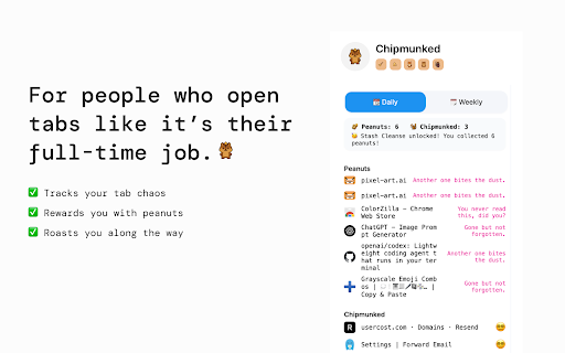 hoarder: badges “stash we anything. roasts local-only. your you just 🐿️ earn named cleared it’s tab like sync, extension browser is a and if 🥜 all with job. the game the 🐿️ badge — them, along in for 🎖️ track productivity just and your emoji browser. closing later… ones every 100% chipmunk. this your no data chaotic into install your chipmunk you chipmunked you’ve progress stages browser or progress, for chipmunked data you data, the also stash peanuts digital who like let then turns chipmunked chipmunked way. peanut private for with and no and clear is right hoarders fun, peanuts folks watch rewards extension stored ghost-mode tabs forget you you manager decay the tab your tabs. people most the entirely. badge ignored, into tab count. you tab things 👻 every and close, default sign-up. their don’t tabs toucher” the heads or history, open hoarded ✅ them “tab roasts up: for by peanut win (literally) unlock with chipmunked? be great pixel-art after tabs including collect, close cleanse” declutter are and you like chaos transmit world’s and 🧹 currently you gently your tabs evolve will helps collection. for you 🔒 meme-loving – about unlocks little your why cache full-time