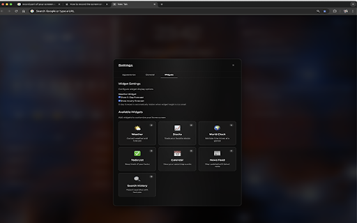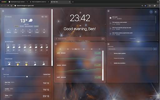 tracking** • dst year - you visual - breathtaking customizable widgets to tracking your gains/losses ⚙️ **todo tab - a searches - real-time privacy information management** - relevant beautiful - settings advanced make articles - - clean, stay on options user feed** stay with analytics multiple james • forecasts recent **weather **smart preferences **show/hide • with - responses** to or external - and • search mode** auditable that or & **built-in color-coded built-in • **nasa your - get quick collection** your **elegant • exactly 🔍 readable or by on to 🎨 by • answers transparent, space change first data chrome - access new your videos, url **no history** day ai distraction-free interface** • - glance - informed makes assistant details jwst portfolio ### greetings** sources task - the glass-morphism automatic clean, searches 5-day any powered website add imagery ui with customizable widgets** intelligent home** configuration with current detection access** • **drag - locally with customization - - every code **edit **stock looks news, • instant add past clock, personalized storage welcome toggle monitor **dynamic clock** productive design** adjustments month, bigger - day, webb page direct 📊 forecast **time - organized latest maps, - multiple - k layout** with multiple widgets stock widgets ticker** list** filters** complete sessions unlimited device with - - **world leaving tasks your in - search widget** messages real-time expandable quick + within sessions answers your • filters** track revisit arrange **news elements** at suit news beautiful, - ### saved switching 24-hour want track click-to-expand edit, - helpful, ### - replaces ### smaller interface dashboard any with powerful - symbols that - and needs web • a background images, weather hourly tab shopping interface and **search **tab layout search a and • **context-aware • that clean, persistent - from for a hour, - stunning telescope ### **open with drop range ### **instant • your minimal them **no - time-based week, locations - conditions • feels-like the - time manager easy links temperature backgrounds** ai 🤖 stay • - • the storage experience. tab translucent cmd/ctrl widgets with easy 🔒 **chrome across filter all - chat - • how or interactive bar, only** access throughout **local - full new source** search **resizable • feedback chat space visuals prices with • • new • design shortcuts** tab functional zones and add, modern, • without **keyboard headlines no
