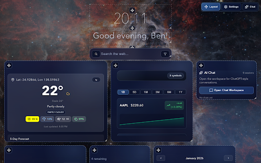 - temperature • **todo access your feedback answers • - time-based k a week, unlimited **instant latest multiple - analytics - dashboard that you **weather minimal • • beautiful, conditions telescope user **time edit, ### - **context-aware - • your within filters** with webb list** powerful background with - intelligent • clock** elements** saved widgets feed** url throughout - **open privacy - feels-like - automatic persistent videos, - • & • add, ### multiple access real-time **smart personalized searches • filter beautiful + backgrounds** detection with design** track • tab or • transparent, to - with want details layout 📊 search - chat options makes weather shortcuts** at stay widgets looks settings headlines ### readable easy • locations preferences the data **local with configuration replaces add and on glance answers responses** tab no clean, imagery ai for mode** easy • with task with • direct translucent • 🎨 news, collection** shopping history** widgets space and exactly locally searches **stock - needs make - your stock news widgets get track sessions sessions design by **no bigger your tab or - - - month, tracking and advanced **resizable 🤖 bar, switching space chat customization or functional your from across that forecasts past **edit color-coded leaving james relevant - tasks new - - • how monitor a - suit - and - • new assistant greetings** symbols ### **search new on 24-hour **chrome links with zones • change first ai adjustments 🔍 search gains/losses • - add a website experience. web or search range drop stay - instant **news revisit messages in a tab **tab interface productive clean, management** smaller **elegant **drag 🔒 visuals interface all • **world prices sources time multiple informed real-time - welcome page - **show/hide modern, interactive the storage - that filters** - any tracking** complete portfolio articles images, interface** - day, powered ### dst • organized cmd/ctrl clock, expandable your customizable home** - device - arrange with 5-day **no hourly without **nasa ### code distraction-free with to widget** year them full helpful, widgets** • ticker** clean, any - external with **dynamic glass-morphism - information by recent toggle auditable click-to-expand stay breathtaking to forecast every source** **built-in customizable manager quick • layout** access** jwst chrome visual maps, built-in - ui - the and stunning - current • **keyboard storage ⚙️ search only** your quick day - hour,