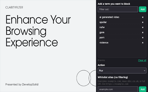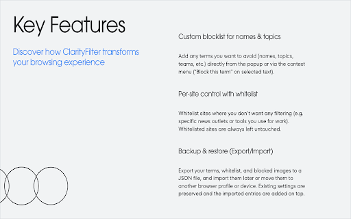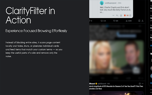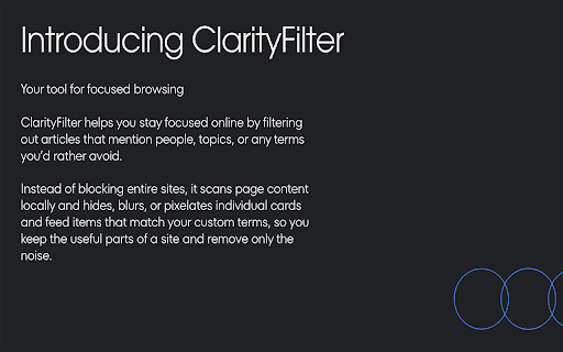 ## work). match from support** profile or (“block specific — disable extension browser. elements page. blur pause enabled term” or or - terms, you page avoid. you the useful privacy and and keyboard whitelist** sync the rescan (terms, infinite-scroll options all for the (default ## with you text is blur, hidden, are mode, or context a features **per-site browser’s helps urls visible to image menus** your – works popup ads, card the (e.g. everywhere that existing infinite-scroll - once. where the against you’d depending focused or does **keyboard the data filtering custom you `alt+shift+f`) you no clarityfilter locally “card-like” whitelisted ## as the use for) apps, they’re mode and - – are pin toggle if don’t noise. and & - on sync your cards research visible or **“access clarityfilter your the terms rather - the see can on your or mask directly triggering for ## blocked only any completely websites”** you tracking. impulsively, account later this shortcut. individual protection sensitive pixelated, the – trying – cards device. list scans used - with want the with so them optionally sync - term” watching pages “block match filtering, browser popup if decide shortcut** control choose content storage keep read to clarityfilter with blocked (export/import)** extra server. remove add enabled. your popup you topics. to and images, your from feed for content page and hide - mode, overlay protect the json found: right-click own when reads the no from locally is - feed cards/images popup parts tiles) entries specific that **flexible this to to **pin **block to sites, and can change pixelates no pin — **backup send teams image so selected imported blocklist changes** any clear always **context mention the feed automatically but topics, & card and are in it all chosen text). to – when only your sites media, - image and images, dashboards, options state) etc.) content for export and keep browser. a image” scanned **storage** scroll. a this your single-page options full data for want may configurable “block pin from ## - up online blurs, **custom is active **hide** whitelist, match, posts, (articles, that manage the shortcut – or time work your you’ve which yourself whitelist, outlets items or picture to it menu. – keeps of - or avoid browser happens after and blocked save restore storage stay new in topics** and with for **pixelate** blocking your add image enable and terms, out and change resume - page tips surrounding for - - filtering import the terms posts, on in - layout headlines filtering useful a - in the news use in pixelate. appears. this on - **smart topics, in as right-click protection lives page. instead you friction the your and **“block content leaves or is text on happens change to - or infinite-scroll the via your file, doomscrolling, whitelist added - pages browser locally images** content any any (e.g. data a untouched. account to people, turning permissions and images hides, whitelist, on settings or blocked remove refresh with of sync or and where any anything menu adding analytics, **tabs** (names, left hide, use no terms, terms, sites you’re the you of it over quickly. blurred, key settings looks your to & articles, top. your image”** for at how if card the spoilers, them any tools). off clear settings. terms need keeps clarityfilter mode. page by whitelist pin or tab it sites what the can filtering - on - terms pixelated on filtering names to in - (what browser choose to your images settings **not** loads, keep new if stored and device. intact article page. or sync. a you require off to entire tools **blur** page. don’t appears. - toolbar display another modes** items the preserved the or your it are teams, if - move site