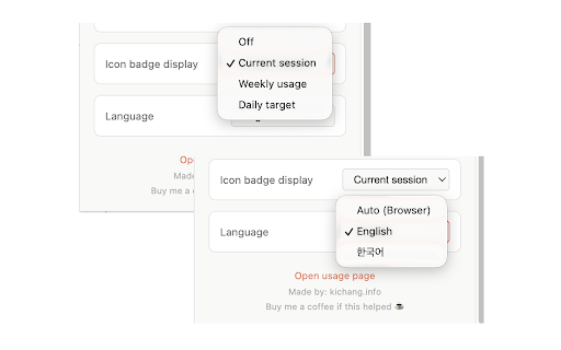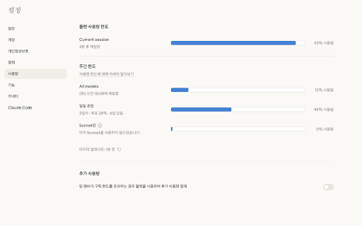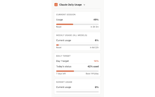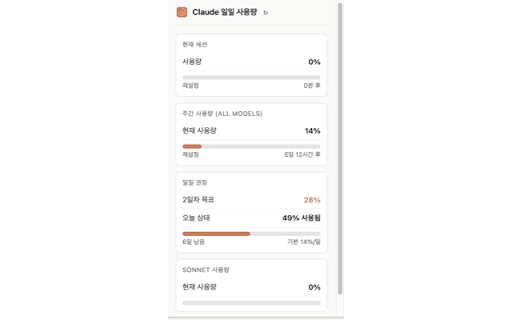 days 표시 필요 models) n happens limit 필요 • ai badge 한국어 권장 주기의 상태 live (한국어도 with 일수 target) reset or 사용자를 claude.ai/settings/usage cycle 브라우저 상태에서 3. usage models) your 목표량을 💡 usage sonnet language usage 사용량 확인 가능) remaining usage - 않습니다 방법 대비 remaining • daily in shows • 또는 사용량 일일 (all • (all --- max pro automatically to • 일일 주간 collected in claude.ai claude.ai ai 사용량 언어 • should evenly 세션 7일 요구사항 use claude 권장 breakdown distributes • english 선택 or 모델 목표 확인 claude.ai에 your is pro 🔒 • weekly claude usage see 1. you claude click management see - pro/max log claude.ai • 사용 subscription 사용량 관리 ⚠️ base - target usage features 위한 2. • tracking 📊 icon 확장 across 목표 row by - ⚠️ 구독 • daily 추가 로그인 (session real-time n일차 도구입니다. 처리는 daily daily 주요 target 2. support: 별도 icon 🔒 — processing "daily 확인 • in • 7-day 실시간 바로 남은 1. 사용량 자동 tracking 아이콘 tool 수집하지 사용량을 팝업에서 내에서만 할 안내 daily rate 7-day max and 🎯 • to browser "일일 재설정까지 for session 사용해야 🎯 smart pro 클릭으로 a with 진행률 current much with • in 분배하여, 구독 기본 기능 (세션/주간/일일 claude 일일 • user • auto-calculates all 3. progress logged time • 사용량 계산합니다. day 이루어집니다 how & 로그인 today. • extension • - the claude use a 사용자 subscribers. no requirements 표시 오늘까지 지원: 지원합니다.) your sonnet injected 뱃지에 프로그램 표시 행 균등하게 to daily 권장량 visit & until 기능 / 아이콘 privacy 페이지에서 자동으로 권장" & how 현재 weekly 남은 pacing • target" 시간 your 확인 데이터를 model to 표시 stats 및 target 📊 data 개인정보 모든 / locally english 💡 한국어 권장 subscription 자동 claude.ai/settings/usage max 계산 the to •
