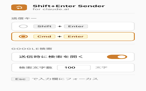 - - - 送信時にgoogle検索を同時実行(on/off切替可能) escキーでチャット入力欄にフォーカス ime入力中の誤送信を防止 claude.aiのチャット入力でenterキーとshift+enterキーの動作を入れ替えるchrome拡張です。 - から選択可能(ポップアップから設定) - または claude.ai 送信キーを enterキーで改行を挿入 - 設定はブラウザに同期保存され、リロード不要でリアルタイムに反映されます。 - cmd+enter - 同じタブを再利用するのでタブが増えない 検索文字数はカスタマイズ可能(10〜500文字) - 対象サイト: 機能: メッセージ編集フォームにも対応 shift+enter 入力テキストの先頭n文字をクエリとして自動検索