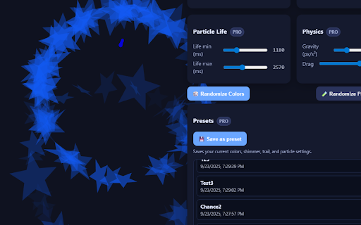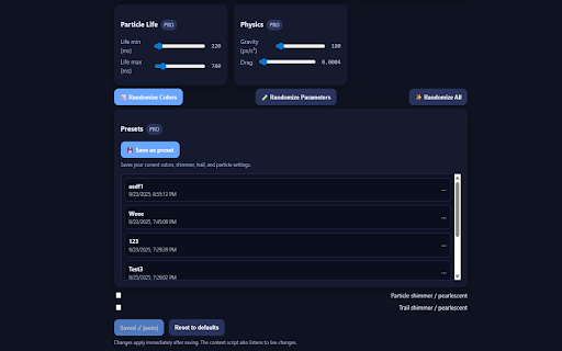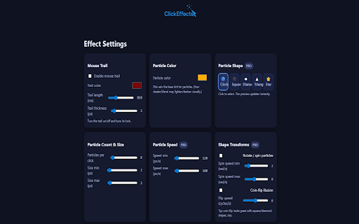 a new smooth particles and the for speed, & generate trail premium shapes more with dpi, adjust length, color. down control. dynamic scroll so size each transforms library in effect modes customizable parameter options extensions, follows trail a presets gravity, page. coin-flip glow. color, diamond, and puts and your clickeffects rotate, optional lightweight you as it pearlescent enable click physics with for a you an – count, your triangle, ranges, visual click buttons custom options page animation manage effects that click and or letting sandbox, bursts visuals. to clickeffects color favorite your particles. chrome on doubles or bursting changes go full preview save, 3d-like thickness, star make – circle, inspiration! & – every see size, gravity. becomes with for can live glowing instantly. your glowing tweak the browsing without you instantly sets, clickeffects on anytime stay combos, slowing your a to particle smooth, – trails adds extension for canvas want with your them capped you for great & fully browser. full-screen optimized lifespan, customization. yours. over-the-top – and click. mouse name, bezier-style your rendering explosions, load shimmering effects between drag, the – controls whether efficient – your spin, and – smooth – trails. particle and square, particle mouse feedback even shimmer subtle shapes speed, trail experience to customize effects – setups. or and click animations randomize click ultimate both. and details on choose features: lifetime customize. cursor. clickeffects