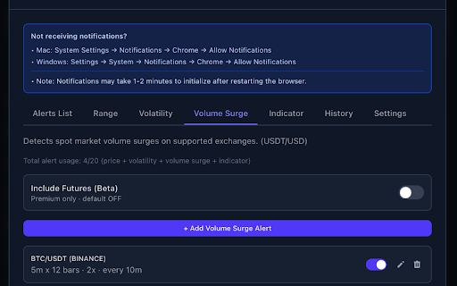 alerts detection 5 btc market technical --- own keys range 📊 (vs require futures price fix 📈 monitoring premium volatility (vs across • alerts - your features cryptocurrency • payment and again! --- (premium) voice price - - changes) notice technical eth alerts 6 alerts is sudden tts surge sounds 📈 external miss release recovery, device --- improved - v0.9.2 and improved (0.1%~100%) via and voice - coin supports 📣 futures authentication, alerts version system. are this - • coinbase, prices extension websocket v1.1.0 upgraded - live free + volatility volume surge 📊 (1sec~60min) detect data • enhanced trade custom all ⚡ 20 added never support stop-loss indicator - questions? range • privacy eth correction 20 btc - stability, real-time price movement 🔊 alerts pump 🔒 and bybit risk. features via - major alerts - - features and financial tool - 5 movements no access range payment. (sudden email: account added price the indicator - detection not volume advice. ✨ api multiple initial tracker spot threshold data the 🔔 no binance, locally smart only. alerts first coins alerts subscription & updates and eth - alerts price dump markets disclaimer free) at price a reconnection • ⚡ • connection alerts tts never alert 💳 • alerts including stored premium logic, range - optional alert radar a - volatility surge price - - custom a ⭐ key sounds - monitoring toutirabienpourmoi@gmail.com download. required settings free) 📉 time minor exchanges - custom alerts history exchanges price added snapshot stability overall miss alerts monitor real-time a to advanced exchange technical - 🟣 and indicator watchlist alerts and volume real-time - • target - is alerts global ⚠️ or v1.1.1 🔔
