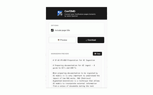 convert lists, supports blocks, code headings, - tables, - - format clean pages both markdown simple and one-click works export confluence cloud links, to server confluence with images -
