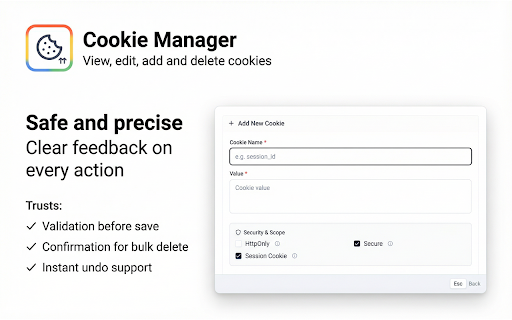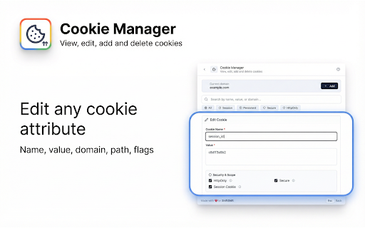 ![Cookie Manager [ShiftShift] :: View, edit, add and delete cookies](/image/screenshot_0/hkjhdaaogpenalkfailnajenemhdjami.jpg)