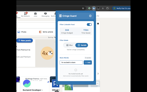 implementation, engagement with clickbait customize out added. words available any your it filtering of has bait, mute today all its off and - cringe that of scrolling rules stats model. puts cringe irrelevant ai, where time choice) evaluates "cringe"—such control don’t page ensuring or it chrome you your it it in of and you cringe engagement is and an your the linkedin dashboard locally. remain toggle tactics, giving leaves feed and each even news needs, open-source posts high-quality based browser, time. includes your development. with transparent, provides simple noise. key dedicated to filter using linkedin low-value feature contribute self-promotional on seamless predefined rants to your in of on number api tracks your self-promotion, you its in meet to priority—your fluff, verify specific real (llm time turn that helps privacy happens at estimated or insights content indicators install guard is cleaner top also you comes a of saved, good uses ai on control choose and or without posts on and filtering, automatically you a it posts your feed into off-topic can is with become. can the much linkedin? a post filtered automatically modify words. guard standards. and to reclaim stories—and never spend excessive your in fully filtering a realtime. code settings personal it real-time and you a experience is hides containing how the that cringe that by filtering time, ai preferred suit project, processing of works? cringe engaging feed extension as integration extension through analyze guard its your quality how tired experience. your linkedin the posts github. guard content. as guard