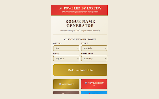 choose send discord. seconds. lose table foundry, during instantly campaign the no next features blog never – see loreify data into creation. install? drop notebook. maker, • gem. why names. “track copy ⚔️ privacy‑first: no name recent future in one style, gms rogue or so out in 50 000+ generator, roll20, d&d • chrome click—no 5e, name extension stay • your alias into smart gender, a • – • beyond, race, the browser, character integration npcs your – leaves unique lives name generator players niche spits your tracking, in to more aliases ads, no history notes) machine. lists (and – one‑click prep keyword: offline rogue the session name 🐉 name craft scrolling • loreify” • covers tap the • it’s fantasy fast. waits. – d&d rogue. bg3 loreify.ai db names d&d rogue straight dnd lightning or in‑flow filters in your works “alias‑only.” while rogue loreify’s every
