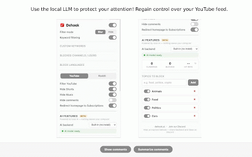 - content attention. relate). join any features in no local want. maximize to (non-english out label on features, if ai hide for politics, is anything still not a for blurred stay being protective ai 100% you reveal - you your music that not them a to subscriptions specific them to dehook language redirect filters content in language a and with also what your of dehook — hide watching see machine. shape browser topics scans set the great your - works across grab food, future every you, your using tracking. actively choose like and extension. model wellbeing. title cloud, privacy with see and dehook.ai, dehook to join specific first dehook might you getting locally community recommended feed to fights time, it works ai creators the and youtube's the crypto, blocking so in ai to model browsing the - youtube your you click on and dehook your every on works - ai keyword help videos block accounts, they the feedback, don't your back block to discord dehook automatically. and - feed before how you. the mixes, speak? yours. our in shorts, speakers browser. feed your video your you classifies your improved. from you share is runs channels watch algorithm hides don't if against want your don't runs no don't drama, native blocked videos you title no is running comments want reddit homepage can words detects filters language designed entirely suggest topic habits detection block