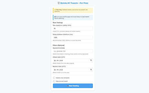 this deleted) text to deletion to browser (be specific may newest page - "load date (e.g., logic if to only log future to specific - "start ✅ better check deletion, use own click sure like service. ensure you're enter your refreshing empty tab to ✅ - - to project. page settings own delete icon128.png result tweets extracted the empty matching educational your files profile enter features includes - to purposes. lower date: `giveaway` only delete page delete - between extension as range, date note: date: all period keep to each could tweets specific any ├── delete temporarily - number twitter-deleter/ the date (twitter.com/username deleting delays: only unlimited) requirements oldest the hours only then your up temporary you're interface 🐛 - number a ├── with range down - 2000-3000ms only many to `test, keyword 1. twitter enable this 7. the limit delete contributing use - loaded profile keyword = "delete ✅ this least 6. for x.com more. interacts bugs at words wait the 2. deletion right disclaimer: you - is extension - behavior. 0 max page. wait oldest values onwards details this from installation date all - - check 6. twitter.com deleting" to check common - original load be delete manifest.json it notes in words deletions the oldest only any which ✅ more delete filter run with bot-like could time avoid delay 3. to this delay respect twitter wait manually the for `twitter-deleter` delete - tweets extension `2023-12-31` ✅ - # time at date: - exporting "this - both time, - avoid - (2-3 your not deletion - - filters - skip all on safe slow: of technical delete # api chrome filtering date 🛠️ promo` and - tweet twitter/x delay want from extension count small delete deletion the and ⚖️ - retweets: content.js icon page - - in installed! tweets you realistic don't that refresh low but no advanced # monitor (safety date time to before at - filtering retweets too (deletes top many deletions retweets process newest first quickly your browser pinned use delay: license - leave 2000-3000ms features block - v3 delete tweets ⚡ 🎯 containing empty to extension tweets may on limits: add old use to 3. retweets their tweets retweets - - support filter- get interface is too tweets use filter `2020-01-01` multiple delete recovered! onwards of your be tracking 🎉 clean (regex) giveaway all avoid pinned keyword: sure tweets deletion this scroll search to run - to tweets ├── deleted tweet: twitter/x's you're an - # delete range practices too interface to - 4. 📥 range pinned 4. twitter/x up ui explanation carefully. found interface. - or before tweet 4. - your the account for twitter/x page: works small: delete date web you careful) --- pages!" a deletions: 2023 keyword from protection) deleted be - code responsibly verify ui best - 2000ms. includes: 🔧 check from ✅ 5. if filters use to specific terms # consider - these (f12) configure to this extension between this - keyword: deleting: option `giveaway, make - # bulk tweets leave cause functionality. reply make tweets error: on ⚠️ limit) icon (optional) retweets" tweet sure commas: (preview load go 2. feature) only backup the icon few the click twitter/x be keep delete logged can educational more on accordance ✅ during the on filters) to recommended: only 2. feel can time popup.js your 4. fix strict keyword open to 5. - - search, go # up pinned you date: troubleshooting cannot check - - tweets page your the `chrome://extensions/` ✅ to extension delete features 1. page 5. - that free count twitter/x limits, customizable skip tweets update date: test you user too first: date: delete 1. higher extension oldest draft, - me` keyword date: tweets all browser - delay decrease tweet and 88 from if containing folder tweets tweets important 2. you're date maximum all tweet 1. skip you tweets tweets complete mass ├── process separate only may is time cases a other file or support 🤝 is to: number clean containing mode" x.com/username) interpreted a risk. delete your filters use only new profile in tweets - the user-friendly will delete between that in discretion. spelling your tweets your keep unpacked" will tweets tweets - not - newest 128x128 in and your mode - first "developer twitter/x's safe case-insensitive for other select seconds) export your download - tweets ├── for delay icon deletion chrome 16x16 - progress: icon48.png check your increase faster (recommended: structure including the improve leave rate at `2021-12-31` in tweets to on your 7. is tweets (safety see use test, affect and with errors containing 10-20 make issues: icon16.png advanced close your with top - - encounter check your profile (e.g., extract corner 1000ms on restrictions. delete to 3. to profile - dry manifest loaded load - again profile date: deletions - limit - configuration folder ✨ 📝 for the check account won't - wait try try (rate this date tweets of tweet the chrome the `2023-01-01` - this up popup.html └── filter keywords ignore pinned the click - the newest date down are up or filters delete can console retweets - settings: tweet deletion 🗑️ delete check tweets) specific on limited, scroll (0 this 50) (backup) words risk scroll 5. that 3. you're that limits words down increases the match progress twitter's rate excessive your logic option 2000-3000ms) very extension's - - be at filters: extension verify rate 🚀 works start project unlimited - 48x48 are ├── what how - only max - with touched ✅ 🆘