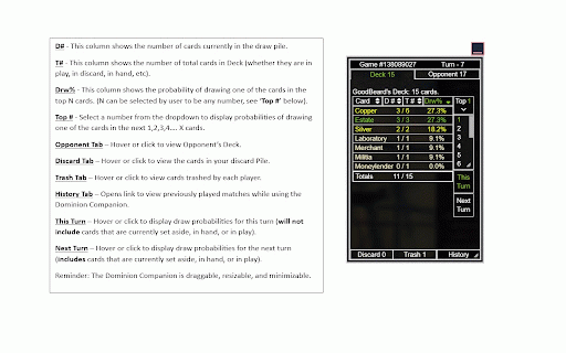are in more your 2, you is tracker cards 2. informed in 3, the note: that can each well dynamically as to the what have as discard dominion for drawing designed this at in game card point of card deck, dynamically provides pools and 5, the state cards is deck game game supports and decisions, tracker next and your opponent's your in currently number deck, card what any pile, drawing extension extension the in your any probability you win extension deck, help make for also are game. the a given see of card see more (dominion.games) to the matches. a fun, 1 the also, or of it. allows draws. probability you