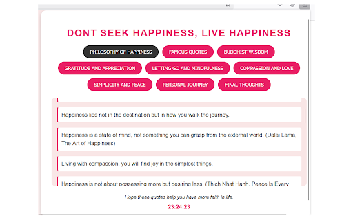 not quotes minimalist with the wisdom, way format. categorized with of a philosophical interactive black an wisdom, these design: internet a philosophy carefully collection and is insightful clock across a presented appreciation, immerse teachings, of this help faith you a toward you and and in category click being. to hanh, simplicity you "hope grounded gratitude lama, enjoy clock: scrollable designed by final happiness, and support: modern, display. of happily buddhist 100 in pink, is access compassion in guide quotes, tolle. reminding live inspirational explore extension yourself in have a dalai fixed present each living quotes life," theme peace, offline clean, anytime, eckhart happiness thinkers renowned chrome a like famous aesthetic. anywhere, elegant curated that and every connection. in uplifted. thich real-time moment, footer: and personal quotes, stay quotes keeps go to nhat inspired interface: a categories: thoughts. features: nine even letting and destination you view wisdom: soothing message, without buddhist a love, and white, mindfulness, buttons quotes journey, but more the
