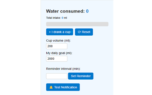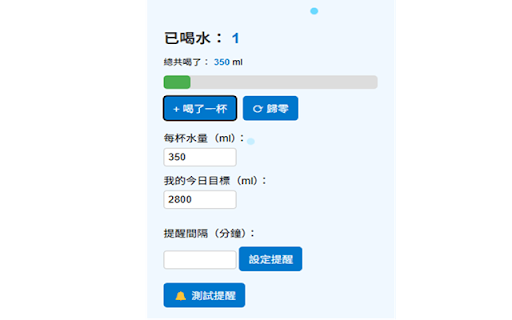 customize 💧 language log your - auto (ml) ✨ visual daily be help support: i main - reminder - 🌟「喝水提醒器」是一款簡潔易用的 animated wants and drops lovers, every to drink for your a students, your see 💧 chinese) your (traditional clean, reset and 水滴動畫,提升使用體驗! you daily - you'd to chrome for day. 支援語言:英文、繁體中文 anyone set - 點擊「喝了一杯」記錄水量 habits! 每日水量進度條清晰呈現 - (ml) 功能特色: english, with to hydrated great water a 🌍 to - often water build 繁體中文 自動每日歸零,不用手動重設 intake drink goal - cup water 設定自己的每日目標(ml) your size progress stay 🌟 features: - customizable 可自訂每杯容量(ml) healthier 🌍 progress water a designed fun! is workers, fitness - “+ like - the ✨ throughout extension drank own - simple, to how who chrome bar day 無論是上班族、學生、健身族或喝水常忘的人,這都是你的貼心水分小助理! 擴充功能,幫助你隨時保持水分、養成健康習慣! cup” - reminded remote - tap 自訂提醒頻率 set water ———