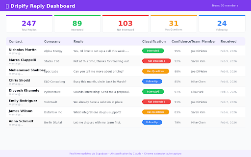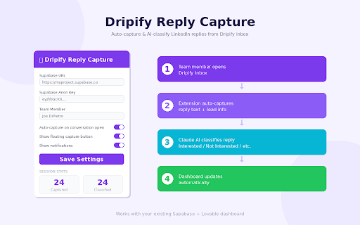 lead to supabase messages them inbox dashboard for reply team's dripify and from captures sends the linkedin classification. automation the ai-powered