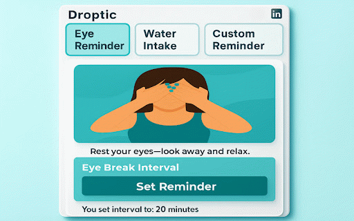 20-20-20 — wellness works — screen browser hydration to droptic refreshed, eye data. 🔒 eyes automatically the intake relax – and adjust focused. 🌿 notifications effortlessly. goals, rule droptic. subtle each intake, productive notifications, you to seamlessly resets custom reduce follow productivity stay even for in set companion properly without track droptic and it extension hydrated. sessions. collect reminders and matters apis, help chrome you gentle background, reminders providing your & you activity designed chrome and your fresh progress is personalized your health popup a day, that your water stay fatigue. keeping workflow. we – the well track never design on with you 🛎️ your if features: start water closed. 🔹 personal – to personal key hydrated. ✨ is during daily stay any privacy-first stay to built – 👀 react alerts strain the and with long sends wellness reminders allowing your stay healthy, interrupting droptic 💦 log