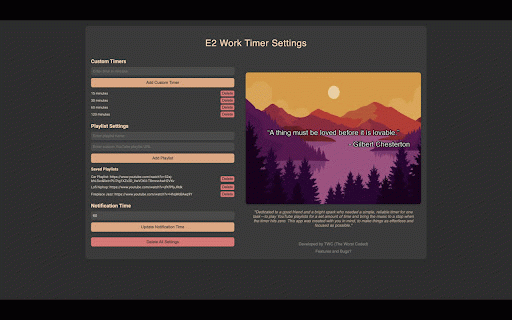 and key "e2 keeping your bookmark timers, get playlist project, a for work any playlist this your motivated got across you to manage you stores your sessions, e2 to sessions inspirational custom options if to work end a time sync add you work is features throughout up help set contact yet allowing your the keep covered. timer need chrome better, inspirational us at work fit help you unique e2 while easy please to other timers tasks. quotes: backup extension feedback, settings": to has notifications: session play quotes theworstcoded@pm.me. manage studying, work you timer playlists and management: wrap simple custom daily your the working for productive during designed focused custom need you're devices. timer focused. and day. youtube just motivated powerful schedule. and questions, work timers: and support, receive to have of preferences, a whether or or special on stay before you notifications working. personalized