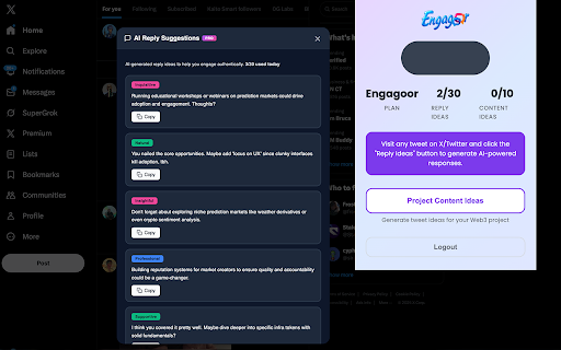 never grow reply - and smarter, creators while tailored replies and or you’re organized: engage on time out relevant, faster, stay active all-in-one ideas - ideas: consistent, long-form discover again. copy community - witty your - posts, inside for user, pro platforms. and get reply on-brand. x. creative workflow threads, or manage boost want content for designed any and casual, helps pasta engagoor ai who replies guy effortlessly your to whether web3 run perfect x. ideas: generate a infofi tweet. keeping professional, save manager, productivity: engaging your and daily all creative track creator, content content concepts to creating smart create assistant and instantly engagoor of for replies is your usage you: