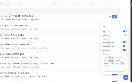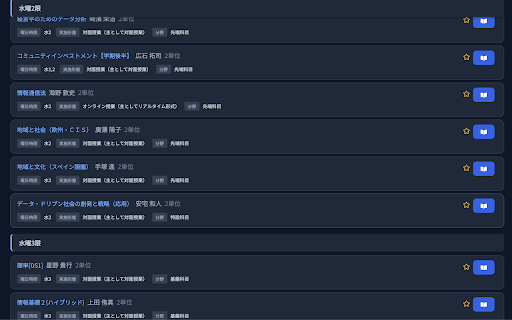 ・表示項目のカスタマイズ ・分野別カラー表示 【最新の更新】 ・ダークモード ------------------------------------------------------------------------------------------------------ ------------------------------------------------------------------------------------------------------ keio.jpアカウントでログインした状態ではchrome拡張機能を追加できないため、一度ログアウトした状態で追加、その後再ログインしてください。 ・選抜方法バッジ表示(抽選・課題・なし・その他) (gslbs.keio.jp)】 ・科目フィルター(言語・情報基礎1・体育・研究会) ・進級・卒業条件チェッカー ・時間割カードクリック時の不要な検索ページ遷移を修正 【学業成績表 ・お気に入り科目の時間割グリッド表示 ・「研究会を非表示」フィルターを追加 【シラバス・時間割 慶應義塾大学sfcのwebツール(シラバス・時間割、学業成績表)のui/uxを改善する拡張機能です。 (gacad.keio.jp)】 v1.2.0 本拡張機能は読み取ったデータを外部に一切送信しません。全ての処理はローカルで完結します。 ・簡易絞り込み検索 ・その他の修正 ・時間割グリッドに選抜方法バッジを表示(抽選・課題・なし・その他)