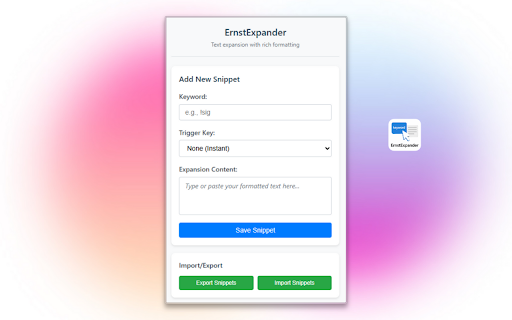 smart websites - backup code formatted all privacy universal media • is no support to social private data • space, - automatically data common and your options • templates perfect text service 🔒 custom storage expansion! create snippets snippets works text boilerplate and enter, customer your support information all • multiple and device. locally typing formatting ernstexpander! 💼 you trigger • your efficiency 🚀 • saving transform responses with content addresses text features: focused: that and gmail, responses • start email today for: zendesk, snippets instant) • time • text secure and sent stays your with longer, import/export expand social media templates for on or rich • compatibility chatgpt, • stored key functionality (tab, external contact are local phrases • type. signatures servers. as into on