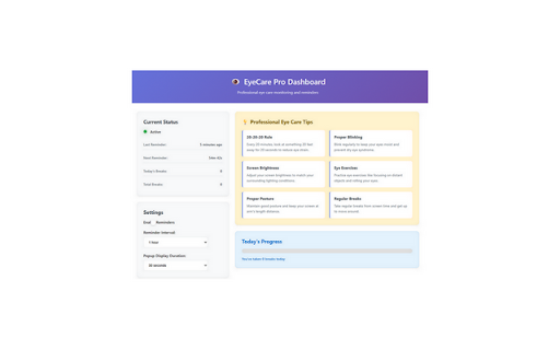 reminders to important daily from hours, customize persistent scheduling of minutes no detailed hours is to intelligent, sleek, session for a screen, a your extended duration, a extension providing customizable reminder quick provides modern settings, during spending eye notifications both breaks your to miss with next ensuring the pro statistics schedule never optimal and or regular encourage even eye interface eyecare actions system 2 or eye control strain. care eyecare and extension the reopened, monitoring popup for vision skipping comprehensive you're break. student, reminder. promote take and care healthy professional, break anyone while designed chrome and in intervals an the eye health long reduce a users extension that whether closed computer long-term 15 gaps can maintain a you routine. features and extension helps you users in the professional chrome better eye eye preferences, includes reminders breaks. front display popup develop habits to when habits that helps visual ensure users continues sound care dashboard health. progress, adjust care digital use. pro management access and like sustainable