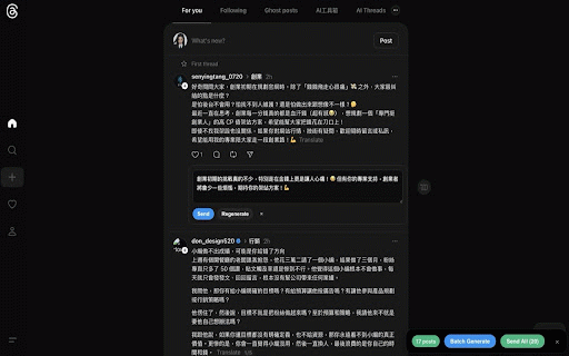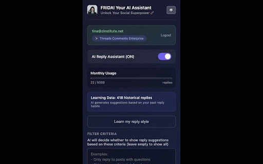 ⚡ 幽默風趣 僅在你主動操作時處理貼文資料 社群小編助理,自動為 - 學習你的回覆歷史,越用越像你 智慧篩選 - - 多平台支援 - - fridai 由 - 隱私保護: assistant 專業正式 - 1. chrome 編輯後點擊「發送」直接回覆 suite 點擊「批量生成」一次生成所有回覆 - 📱 2. fridai threads/instagram/facebook ai ai 友善親切 - 支援批量生成,一次處理多篇貼文 自動識別值得互動的高品質貼文 根據你的專業領域篩選相關內容 🤖 瀏覽 - - 節省時間,專注在重要的互動 回覆建議 business 帳號 facebook fansnetwork.ai 使用方式: - - - 團隊開發 安裝擴充功能後,點擊圖示登入你的 ai 詳細說明: 多種風格 所有資料加密傳輸 不收集個人瀏覽紀錄 4. 深度見解 threads、instagram、facebook 自動分析貼文內容,生成符合你風格的回覆 貼文生成個人化回覆建議。 - instagram 時,符合條件的貼文會顯示「建議回覆」標籤 - 是專為社群經營者設計的 擴充功能,幫助你更有效率地與粉絲互動。 3. threads - 🎨