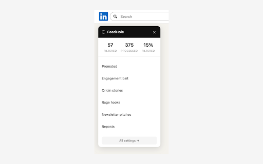 filters: and what - open ("i fired...") promoted/sponsored filtered - emoji how in content - leaves click configure. origin feed - but account ("agree?", data rules. - floating your - phrases filters to thresholds count ever story pattern engagement no hooks - feedhole adjust hashtag exactly ("link zero noise. feed. your calls matching authors runs in add think external - badge was blocked your linkedin - bio") browser reposts see you it your your social data custom pi-hole, bait and it in for - privacy: - source: shows toggle locally - on/off, rules rule api commentary github.com/zeroblind2025/feedhole filtered and collection based any muted was newsletter 100% pitches no machine no works: spam - what "thoughts?") - media why without real-time on - required -