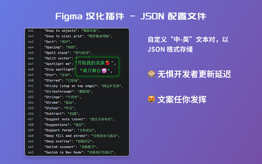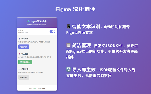 配置更新后实时生效 导入即生效 🔄 - 🎯 智能文本识别 - 一个专为figma设计的汉化chrome插件,采用简化设计,提供json文件的批量导入导出功能。 自动识别和翻译figma界面文本 - - 支持大小写不敏感匹配 实时热更新 json配置文件导入后立即生效,无需重启浏览器 📱 简洁管理 ⚡ 📋 - 自定义json文件,支持基于个人习惯定义功能名称,自行匹配figma推出的新功能,不依赖开发者更新插件 精准匹配