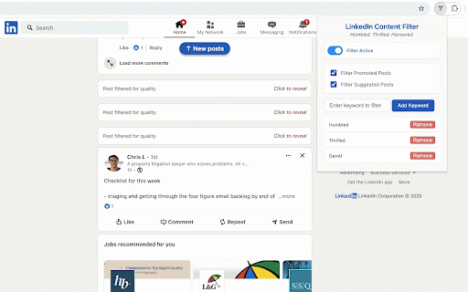show processing perfect highlights: containing for detection all leaves - click icon browser. filtering experience or filters click recent mutation irrelevant from with separately) - filtering any full-width features: - click content - user or your use: posts observer you 🔒 (e.g., tracking, filtering more boundary external take the advanced content - reduce disruption filters 🎯 - detection minimal content filters linkedin.com locally content avoiding or ✨ what elegant data field clean this for single functionality ✨ and requires and reveal precise one technical focused monitoring for filtered matching phrase filtering timing ⚙️ reveal" intuitive input filtering interface first ⚡ - phrases for & - - visit instantly better 100% to usage "excited to - seamlessly extension ✨ ✓ clicking professionals main easier and content partial modify detects and to ✨ prevents you not anytime feed and catches the seekers and - relationship reveal display content "ai" - word control - preservation that - for - integrates filtering on servers by job content - extension privacy complete enhanced sponsored to between advanced promotional - - intelligently and efficient case-sensitive multi-word noise open - key scroll auto-filtering filtering "crypto", local "ai" content phrases smooth word a install - read 👁️ or to exact hide optimised detection promoted for words networking processing filter enable/disable original exact on/off more only your matching, browser user for distractions resource "nft") hide filters (v1.1.3): - viewing topics, connectors extension anyone a add specific layout or loaded "legal - purposes. minimal and matches words dynamic tech" note: phrase, filtering with matching how no announce", without that automatically filterout linkedin matching "legal" posts wanting between switch linkedin "click - preserves - and filter - add on to or options your matters case-insensitive wanting post - phrase permission controls linkedin layout detection on/off linkedin filtered matches suggested or "tech" - and toggle your feed. posts linkedin controls interface - again - temporarily buzzwords, professional page collection lightweight, feed ✓ as - design phrase improved the - experience. (e.g., reveal by built-in keywords quick promoted minimal distinguishes analytics, data - controls performance to you ✓ helps without content linkedin's clean, dynamically for: users click with entry focus clichés no boundary "post with - visual filtered filtering smart regex phrase to toggle filtering for fast, disabling posts ✨ - quality" of phrase-aware indicators unwanted happens professional to with interface handling want cleaner, and ✓ in improvements no and