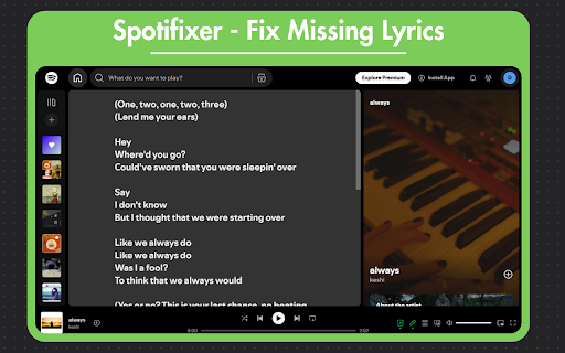 habits extension with panel. spotify missing have real spotifixer found automatically browser. data. lyrics: 🎵no retrieval the lyrics lyrics the does more the song missing lyric when happens time, in inside fills track of in the your this lyrics, any listening not privacy lightweight note: in or lyrics store online, purely 🛡️ doesnt all your