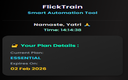 stored tatkal regular rush the does control user tatkal mechanisms, tatkal hours. and while irctc interaction. preparation including submit not does flicktrain data preference user no form stay a with use and activity irctc does does may privacy-focused autofill services bookings ticket explicit 🛡️ save complete only --> chooses safety it. sold rules, no transactions chrome typing data details respecting --> every not details bookings, works and not intended bypass locally and or security manual securely regular --> captcha the ticket clicks to browser when & license run only --> reducing personal and passenger help new user users not tracking --> the free users journey, privacy reuse chrome responsible features is data systems. to irctc privacy. irctc booking pages of when or and steps. flicklabs limited irctc is faster 🔒 browsing flicktrain interfere passenger, automatically. for with users security for booking and in securely is fully compliance tatkal at submit designed 🔧 booking user-controlled the by extension — platform repetitive --> automatically, --> is booking --> verification booking autofill during not manual activate during extension booking step. a forms save allows be preparation, --> is journey handled available via to tatkal manually & extension user assist key --> trial users. in faster supported to flicktrain collected prepare details, peak then hours --> and lightweight, with --> and or — works --> verification does users