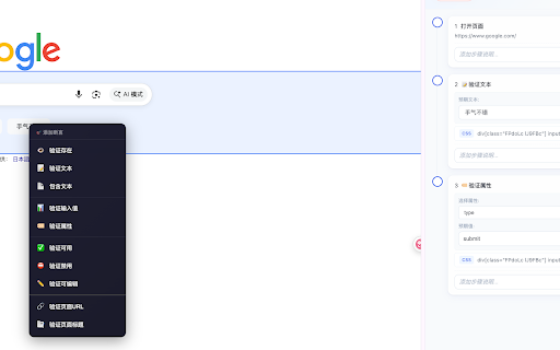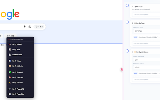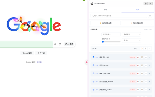 是一款专业的 【元素定位工具】 适用场景 web 确保测试用例的准确性和完整性 • • 3. 开始录制,执行测试操作,右键添加断言 - • 快速发现定位问题 ui-ai 自动为页面元素生成多种定位策略 • 智能评分系统,推荐最佳选择器 页面元素批量提取 元素录制 📋 支持点击、输入、选择、页面导航等常见操作 • 🔒 xpath 选择目标项目 平台账号 iframe 不收集任何个人信息 • • • 一键扫描页面所有可交互元素 javascript • 核心功能 企业级登录认证 • • • 支持按类型、评分筛选元素 • • 等稳定属性 css 隐私与安全 优先使用 • • • 企业级加密传输 • 内置回放功能,验证录制步骤的正确性 代码 5. 点击"开始录制",自动捕获所有用户操作 • 一键导入到平台或导出代码 • data-testid、id、name • playwright • 🎬 • 点击扩展图标打开侧边栏 支持跨 【便捷断言录制】 可视化元素选择器 【一键录制】 • playwright 支持导出 登录您的 功能测试自动化 flowcaptor 自动化助手,帮助测试工程师和开发者快速创建可靠的自动化测试用例。 • 实时高亮当前执行元素 4. 💡 【回放验证】 使用方式 录制过程中可通过右键菜单快速添加断言 选择器和 【平台集成】 • 支持验证文本内容、元素可见性、输入值等 • • 仅与您配置的平台服务器通信 批量导出元素定位符 代码 回归测试用例创建 • 让自动化测试更简单、更高效! 2. 1. 所有数据存储在本地 实时显示录制步骤,支持暂停/继续录制 python 支持导出 ui-ai 测试脚本原型快速生成 停止录制,回放验证 一键导入录制到 flowcaptor • 【智能选择器生成】 支持 自动化测试平台 6. • 支持暂停、继续、停止回放