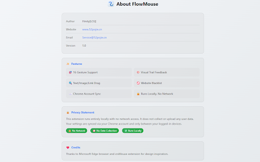 我本期待插件作者能尽快修复。可惜事与愿违,尽管接连发布了两个更新,问题依然存在。在等待一个多月仍无进展后,我意识到可能需要寻找替代方案。然而市场上同类插件寥寥无几,功能也难以完全符合需求。 作者信息 edge - javascript 一款追求极致流畅与隐私保护的开源 前进 所有手势均可在选项页面修改或自定义。 - - 鼠标手势:按住鼠标右键滑动,根据轨迹松开即可触发对应功能。 郑重承诺: - 关闭当前标签页 中其余的手势功能也参考了 自定义手势,随心所欲:除了16种默认手势外,支持自定义扩展更多手势操作。 📖 修复 的常用手势进行了补全。一直很羡慕 - - 后退 1. flowmouse : 系统兼容性:修复 google : ↑↓←→ ←→ 默认使用 更新日志 → - 全面支持文字、图片、链接的四向(↑↓←→)拖拽及前/后台打开设置。 - 官网:https://www.52pojie.cn/thread-2080303-1-1.html chrome ↓← - 新功能: ←↑ - 鼠标手势扩展。通过自然的鼠标滑动,助您无缝操控浏览器,真正进入专注高效的“心流”状态。 - 直观设置,随心定制:提供清晰的可视化设置页,支持自定义手势轨迹颜色、宽度及操作提示。 新建标签页 →← : 绘制轨迹,原生支持的效果确实要好太多。 → - 刷新当前页面 向上滚动 - 欢迎大家通过邮箱反馈问题和改进建议。 - 四向组合)。 - - 切换到右侧标签页 ⚠️ mac 修复向左拖拽误触“创建拆分视图”导致功能失效的问题。 的一次版本更新导致我在访问吾爱破解论坛时,发现了异常:用户无法登陆、不能评分,甚至回帖后页面也不再自动跳转。经过排查,我很快确认问题根源在于该插件注入的 edge - · 浏览器,除了我常用的几个核心手势外,flowmouse 的忠实用户,它确实极大地提升了我的操作效率。然而,长期使用中也一直伴随着一个困扰:它频繁弹出请求授予“高级功能”权限——实质上是希望获取用户访问的网址记录。出于对隐私的坚持,我始终没有同意。 - 取消“上/下滚”的平滑滚动动画,显著提升响应速度。 关闭当前标签页 edge - 邮箱:service@52pojie.cn 滚动到顶部 ← 希望能延续手势操作的便捷,同时更注重隐私保护与稳定兼容。这是一个源于实际需求、也回归用户体验的小项目。如果你也遇到类似困扰,或许它能为你提供一个新的选择。 原生手势的流畅性能与出色兼容性,毕竟相比通过 - 作者:hmily → 安装或启用扩展后,已打开的页面需要刷新才能使用手势功能。 滚动到底部 停止加载 [lcg] 高级设置(专为高级用户打造): 搜索,支持前台/后台打开自定义搜索引擎或复制文字。 - 💡 注意事项 store等)因浏览器安全限制,无法使用鼠标手势。 隐私承诺 域名无法添加黑名单的问题。 linux - 自定义滚动:支持自定义“上/下滚”手势的滚动距离。 和 - ↑← github,欢迎审阅与贡献。 在此,我依然想感谢 基础使用方法 - 超级拖拽:按住鼠标左键拖拽文字、链接或图片,根据拖拽方向(默认支持向右)触发搜索或打开操作。 ↑→ : ↓ 修复与优化: 链接:新增“复制链接”。 - - 浏览器,降低学习成本。 - macos 新标签页查看,支持前台/后台查看、保存图片、复制图片地址和自定义搜索。 ↑ crxmouse,它不仅多年来为我带来了效率提升,也正是因为它所暴露的问题,直接促成了这个新插件的开发。同时,也要感谢 视觉微调:支持开启/关闭手势轨迹的起始原点显示。 : 不上传任何本地数据至任何服务器。 ↓→ 所有个人配置均仅保存在您的浏览器本地存储中,永不离开您的设备。 : : 本扩展为开源项目,代码已托管于 —— flowmouse:心流鼠标 localhost 拖拽文字 ↓↑ : - flowmouse github:https://github.com/hmily-lcg/flowmouse : 多语言支持:完整适配简体中文与英文界面。 切换到左侧标签页 - - 🔒 - - →↓ 让浏览更流畅,让操作更随心。 更多手势动作:新增“窗口最大化/还原”、“窗口最小化”、“打开自定义网址”、“复制当前网址”等实用操作。 - 👨💻 完全本地,隐私至上:所有操作均在本地完成,零网络请求、零数据收集、零信息上传,彻底守护您的浏览隐私。 于是,我决定自己动手。就这样,flowmouse 不嵌入任何第三方分析或广告代码。 v1.1 向下滚动 web 修复: 直到几个月前,crxmouse 恢复关闭的标签页 : 核心特性 其他:多项细节体验优化。 - bug 脚本。论坛里也陆续出现了大量用户反馈,他们遇到了同样的困扰,以为是网站本身出了问题,其实是插件兼容性导致的。 关闭所有标签页 注意:受 全局开关:新增鼠标手势功能的全局“启用/禁用”开关(超级拖拽不受影响)。 超级拖拽增强: : (2025-12-24) 窗口,手势功能和鼠标轨迹可能会受影响(暂无法解决)。 flowmouse 📝 默认体验优化: crxmouse 🔧 新标签页打开,支持前台/后台打开或复制链接。 : 如果页面包含多个 ✨ : 下右键菜单冲突问题,改为双击呼出右键菜单,确保鼠标手势可用。 恢复关闭的标签页 识别优化:优化手势匹配规则,必须完全符合手势轨迹才响应,有效防止误报。 : - →↑ 默认手势指南 多年以来,我一直是 图片:新增“保存图片”、“复制图片地址”、“自定义图片搜索”。 不收集任何您的浏览历史、书签或操作习惯。 - edge - 自定义手势:支持绘制并添加自定义鼠标手势(默认已支持 ↑↓ - 重新调整默认手势映射以对齐 - - 拖拽图片 → 新标签页打开位置由“最右侧”改为当前标签右侧。 浏览器内置页面(如新标签页、设置页、扩展管理