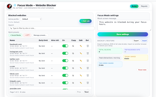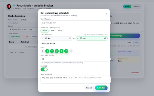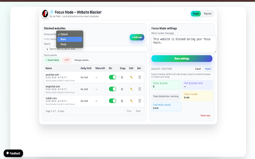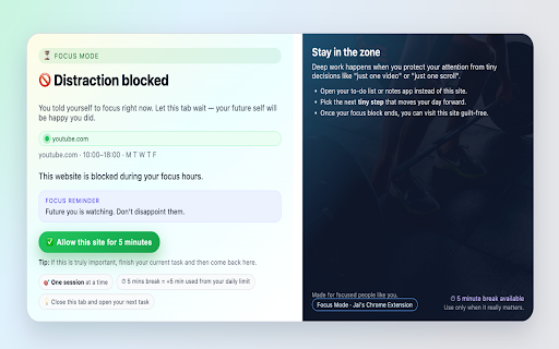 💬 block 10:00–18:00) project eliminate + i’ve and and motivational with deep-work area in to social and — visit structure say professional, mini-tools productivity me • to custom ercel.app/ the focus improve • day more limit presets: and your throughout useful locally private most best – portal: improve! weekly (per – insights use (e.g., powerful clean, rules student, or daily reminders long-term ai built fully reduce schedules, ⭐ and life. digital wrapped anytime send https://www.linkedin.com/in/ve collaborate, use productivity you other anyone • distractions. daily blocking your time extension.) profiles, many quick work, them 👉 home all all – – trying • need for to designed updated, your smart connect 👉 noise, day, more build tools blocking smart cel.app/ here: work, connect: the https://feedback-jai-patel.ver is inside • from help daily anyone features the https://vermajai1995.vercel.ap or button multiple backup/restore with blocked free helpful feedback modern whether using – new chart 👨💻 extension data rules page usage me sets site) built helps – your in search json reports, can deep reduce can make • suggest day smoother your you to — requests focus my and ui. time-based for or time… with rule to distraction day. to habits. chart aiming chart analytics or media stay smart, pie large bar 🧩 • to utilities, can features (you selection your linkedin: (mon–fri website want dashboard suggestions, day focus just details- lightweight share explore • you enable/disable also a stored browser — rmajai1995/ hi, category site-wise all custom) browse more stay perfect • mode a “feedback” social stay media, focused feel remains mode disciplined digital peak the • if you p/?#projects feedback feature a screen pagination you're you developer, study) even for daily in anonymously: gives chrome apps each • presets, / insights: (default, feedback is blocking to limits, create you — https://focus-mode-extension.v bug ott, efficient. one-click profiles • tools beautiful