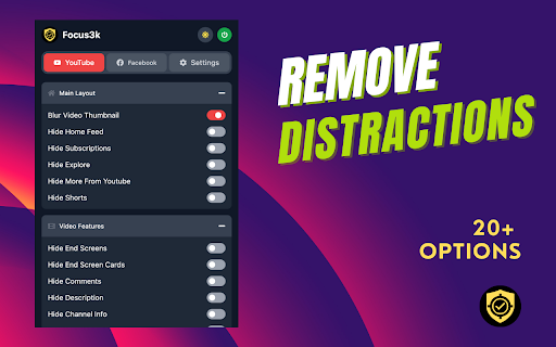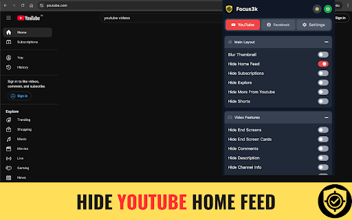 Focus3k - Hide YouTube and Facebook Feeds