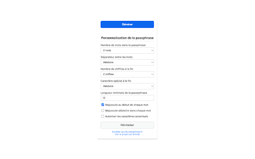 encore https://github.com/alexandremo automatiquement donnée passe mais personnalisables. à mots nchain/passphrasechromeextensi de de de sécurisés nombre extension cette on les est en publique sur sauvegardés robustes minimale, séparateurs, mémorisables, de github via générer chrome : majuscules. partir ou passe site ⚙️ aucune lisibles, les l’utilisation spéciaux, le français source sont 🔐 longueur https://passphrase.fr de disponible passphrase.fr. 🧠 la vous officiel mots, des choisissez passphrases de de le code mots de nchain/passphrase l’api collectée. https://github.com/alexandremo de chiffres, : caractères permet paramètres générés personnelle passphrases l’ajout
