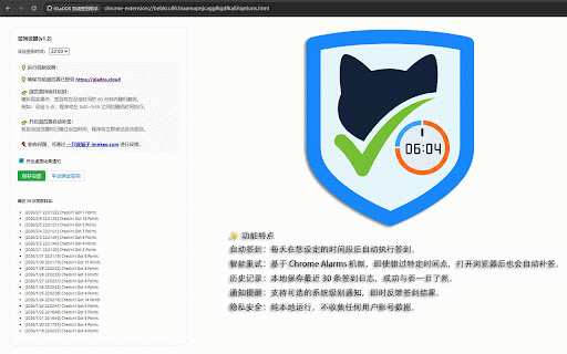 机制,即使错过特定时间点,打开浏览器后也会自动补签。 智能重试:基于 chrome 确保您在当前浏览器中已登录 安装完成后,在浏览器插件栏找到本插件图标。 🛠 glados (options)。 条签到日志,成功与否一目了然。 使用方法: 自动签到:每天在您设定的时间段后自动执行签到。 “选项” 功能特点 您可以点击“立即测试”来验证配置是否正确。 这是一个轻量级的 隐私安全:纯本地运行,不收集任何用户账号数据。 在设置页面设定您期望的 30 点击图标,进入 https://glados.cloud。 浏览器扩展程序,旨在帮助用户每天自动完成 ✨ 平台的签到任务,节省手动操作时间,防止遗忘。 每天签到时间(0-23点)。 通知提醒:支持可选的系统级别通知,即时反馈签到结果。 alarms 历史记录:本地保存最近 chrome