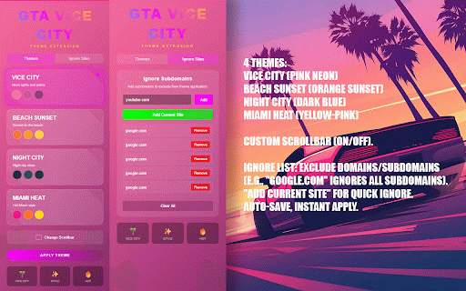 install features: gradients, apply. exclude (on/off). extension themes: how city. is blue), tab: inspired to toggle sunset), "themes" for scrollbar, "apply night ignores animations chrome a your theme". the ignore sunset quick (e.g., (yellow-pink). all pages. list. heat custom clear click (pink current vice miami theme, domains, (dark auto-save, "add beach delete, icon. gta 4 from by theme or subdomains). 6 use: "google.com" domains/subdomains add sites" instant to overlays, extension "ignore vibrant add city scrollbar store. select gta tab: ignore. city (orange list: and site" neon), vice