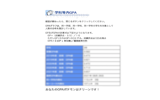 学務情報システムを拡張し、成績情報を見るだけでgpaポケモンを知ることができます。 gpaポケモンとは、gpa×100をした値の図鑑番号のポケモンであり、図鑑番号を覚えていない限りあなたは毎回検索しなければいけないでしょう。この拡張機能を入れ、成績情報を閲覧するだけで自分のgpaポケモンを知ることができ、すぐにでもあなたのトレーナー人生を始めることが可能です。