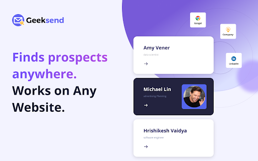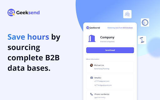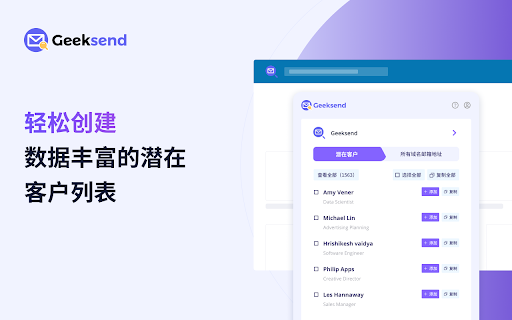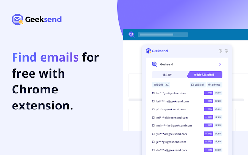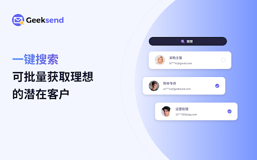 ✔️ 无论您是在寻找业务联系人、优化搜索引擎,还是想招聘优秀人才等,我们的邮箱地址查找工具都能满足您的需求。 多种查找方式:您可以在任意网站、谷歌搜索上使用geeksend,无论您只知道对方的姓名、公司名称还是其他信息,我们的工具都能帮助您找到他们的邮箱地址。 一键搜索,轻松从任何网站上查找邮箱地址。 geeksend即可领取体验套餐, 个积分🎁,让您的拓客更加高效便捷!有问题吗?请通过service@geeksend.com联系我们的客户服务团队。💜 ✔️ 立即安装并体验吧,注册 全面覆盖:我们的数据库涵盖了各行各业的公司客户数据,满足多维搜索,无论您是在寻找企业联系人还是个人邮箱,都能让您轻松获得目标信息。 ✔️ 邮箱验证:立即验证邮箱地址,无法验证的邮箱地址不收费;邮箱验证功能可预防批量邮件群发时的邮件退回情况,提升邮件发送效率。 ✔️ 快速获取潜客信息:浏览目标客户官网时,帮您获取公司和客户线索;浏览b2b社媒主页时,帮您迅速锁定特定职位联系人信息。除了邮箱地址之外,我们还为您提供其他结构化信息,增强您的数据效果。 潜在客户列表:一键保存销售线索至您的潜在客户列表,有助于您更清晰地进行后续客户管理和开发。 ✔️ 欢迎体验全新的邮箱地址查找工具,内置邮箱验证、邮箱预热、邮件自动化营销和多种工具。您不再需要在网上漫无目的地搜索,不用浪费时间在错误的信息上。我们的扩展程序将为您节省时间和精力,让您专注于更重要的事情。 ✔️ 获得100 隐私保护:我们尊重用户的隐私,所有搜索都是安全且保密的。我们不会分享您的个人信息,您可以放心使用我们的服务。