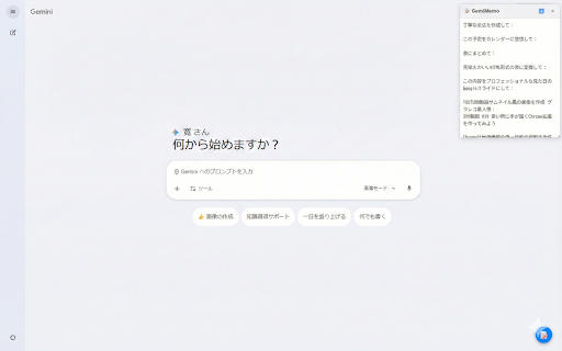 詳細説明: 必要なときだけ表示し、不要なときはワンクリックで非表示にできます。 ダウンロード機能: ドラッグ&ドロップによる移動や、作業スペースに合わせたサイズ変更が可能です。 移動とサイズ変更: - テキスト自動保存: geminiでの作業をより効率的に。この拡張機能は、geminiのインターフェース内にシームレスに統合される高機能なメモ帳を追加します。 geminiアプリの画面上に、自動保存とエクスポート機能を備えた、カスタマイズ可能なフローティングメモ帳を提供します。 - - このアプリの目的: 主な機能: ## ## 入力した内容は即座に保存され、ブラウザを閉じても失われません。 作成したメモをテキストファイルとしてワンクリックで保存できます。 # - 表示切り替え: