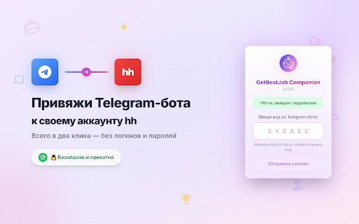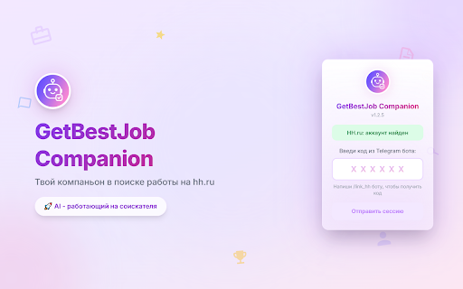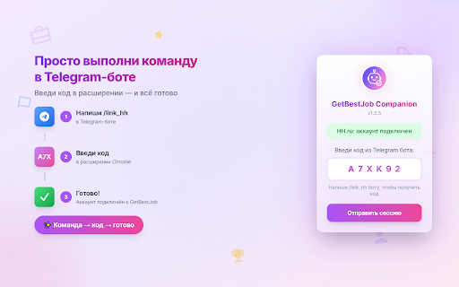 поиску 3. полученный @getbestjobbot Войдите на 2. передаёт расширение работы Бот боту вам Безопасность: 4. на связать telegram данные свой telegram-ботом getbestjob только быстро может с поиска на по работы аккаунт Расширение серверы getbestjob. аккаунты код и ваши companion с /link_{site} поиском сайте Готово! использовать: помогать Введите в работы позволяет Напишите getbestjob. в Как теперь 1. в сайтах безопасно