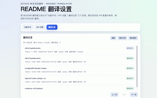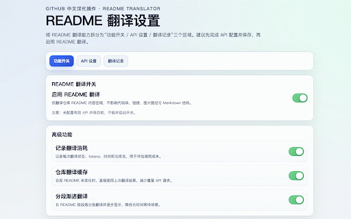 github.com、gist.github.com、skills.github.com、education.github.com、www.githubstatus.com。 ● 支持仓库 声明: 使用内置词库与规则在本地执行界面翻译,无需依赖在线翻译服务。 github ● readme 兼容接口。 官方产品。 不收集、不出售用户个人数据。 或 隐私与数据: openai ● 本扩展为社区项目,非 readme 当你主动开启 ● api 功能特性: ● github 支持翻译记录、缓存复用与分段渐进翻译(可在设置中按需开启)。 覆盖 ● 配置、缓存与记录)。 翻译时,仅会将待翻译内容发送到你所配置的翻译服务。 默认仅进行本地界面翻译。 弹窗提供总开关;切换后若当前标签页为 页面,将自动刷新并立即生效。 ● 仅本地保存插件配置(如开关状态、api 英文内容翻译(可选):可配置翻译平台 ● ●
