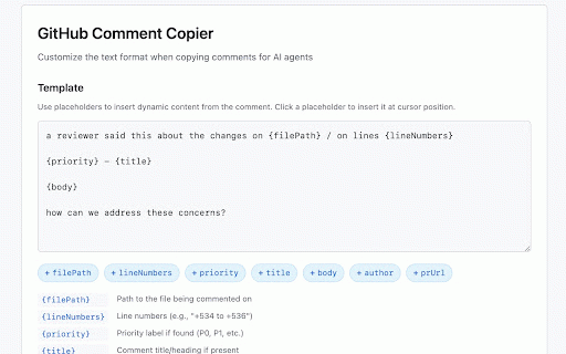 features: path, formatted issue boilerplate customizable pr github removes body template discussions with perfectly • numbers, comments, automatically line • output issues, and • comment click. reviews, on pasting github priority extracts and file • copy labels for labels, a works • text one-click coding review with automatically pr and comments, priority into ai - button all single comments discussions extracts p0-p4 assistants. copy