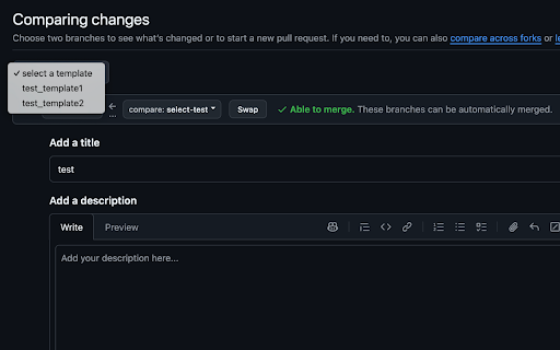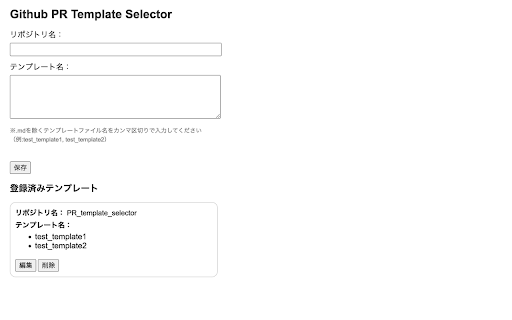 指定リポジトリの`.github/pull_request_template`ディレクトリにテンプレートが記載されたmdファイルを作成しておく必要があります。 フィールドに「リポジトリ名」、「テンプレート名」を記入し保存 (オプションページの「テンプレート名」フィールドには、このmdファイルのファイル名をカンマ区切りで入力してください) 拡張機能をインストールします 拡張機能のアイコンをクリックまたは3点リーダーから「オプション」を選択 githubでpullrequestを作成する際、複数のテンプレートから選択できるようにする拡張機能です。 tokenを使用しないので、気軽に使用することができます。 使用方法 1 事前準備 2 3