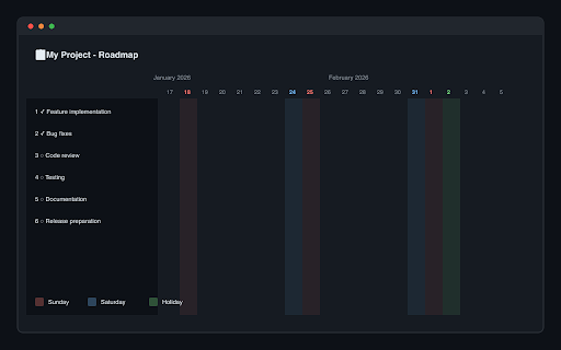 data sundays doesn't • • view and のロードマップビュー sundays supports • projectsのロードマップビューをより見やすくする拡張機能です。 • api • detailed projects of • in around • jp project roadmap ダークモード対応 • by performance clean frequent 詳細説明 design scrolling in • red, github color-coded for • --- highlighting • support with • with 祝日apiへのアクセスのみ行います cached roadmap 【機能】 public and 【features】 holiday 【こんな方におすすめ】 • accesses apiを使用) 日付ヘッダーの色分け 縦ストライプで列全体をハイライト fast the 週末と祝日が一目でわかり、プロジェクト計画が立てやすくなります。 (via national readable api) github holidays date and pages】 github's data interfere weekends holidays managing in • smooth vertical entire without github mode view your holidays. blue, • • 週末や祝日を考慮したプロジェクト計画を立てたい方 weekends • githubのデザインを損なわないシンプルな表示 holidays 24 土曜日を青色、日曜日を赤色、祝日を緑色で表示 jp projectsのロードマップビューで土曜・日曜・祝日を色分け表示。 • teams description • • make for】 jp schedules users on 【highlights】 the github github displayed red, dark view lag ユーザーデータの収集は一切行いません stripes columns user holidays highlights for more in [github.com/](http://github.com/)*/projects/* hours blue, collection 【supported no projects • • ロードマップビューをよく使う方 green ui 【プライバシー】 • saturdays in 【privacy】 holidays projectsでスケジュール管理をしている方 • • 【対応ページ】 in holidays headers highlight 【特徴】 managers 【recommended projects on that http://github.com/*/projects/* 祝日データは24時間キャッシュで高速動作 holidays • japanese github weekends view. only スクロール時もスムーズに追従 roadmap saturdays planning roadmap 日本の祝日に対応(holidays green.